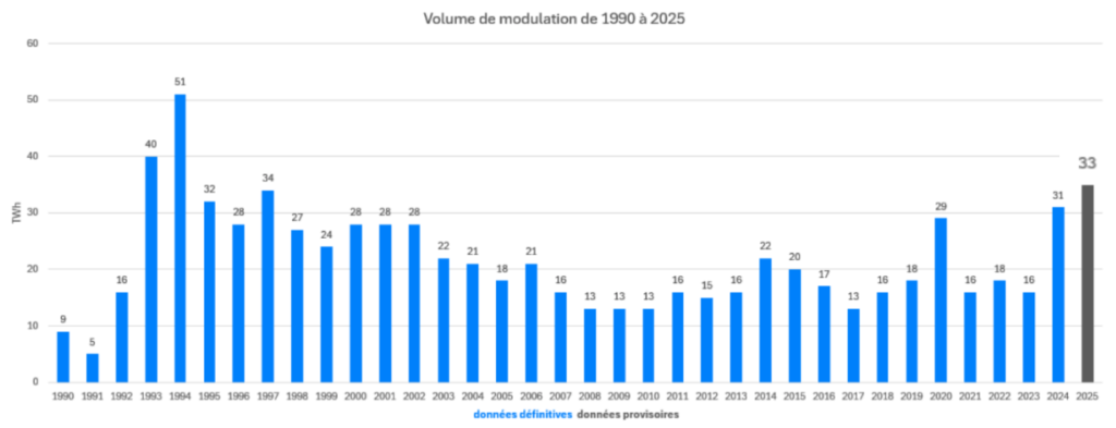 Volume de modulation de 1990 à 2025 (Source : Étude sur la modulation EDF – 2026)