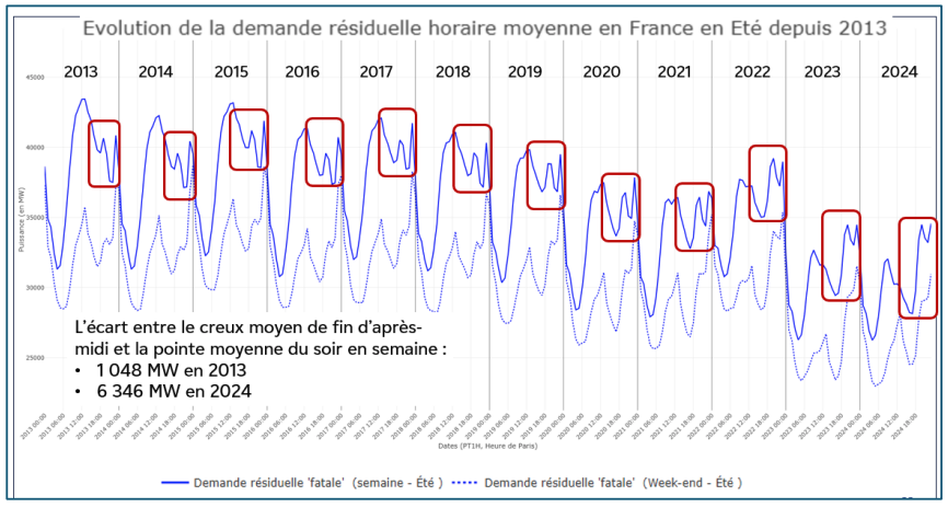 Evolution de la demande résiduelle horaire moyenne en France en été depuis 2013 (Source : Étude sur la modulation EDF – 2026)